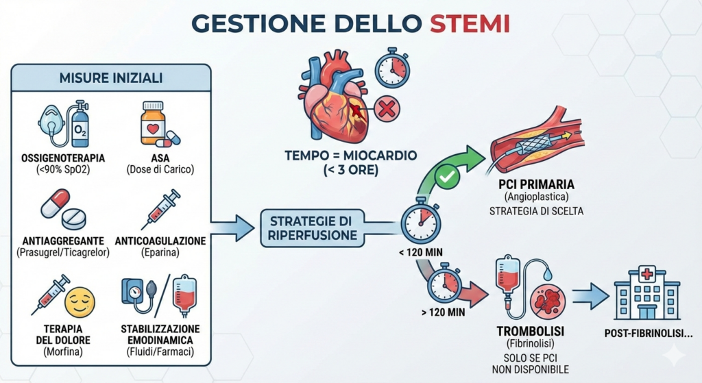 Con la diagnosi di IMA confermata e localizzata, e la distinzione critica tra NSTEMI e STEMI stabilita dall’ECG, la strategia terapeutica si diverge in due percorsi distinti e tempo-dipendenti.