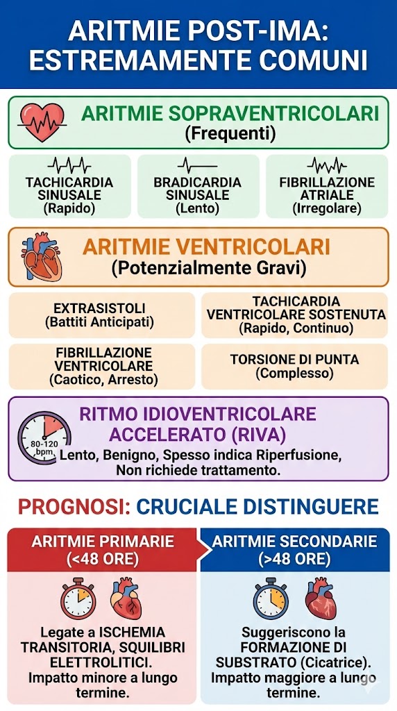 Prognosticamente, è cruciale distinguere tra aritmie primarie (insorte entro le prime 48 ore) e secondarie (dopo 48 ore). Le prime sono spesso legate a ischemia transitoria e squilibri elettrolitici, avendo un impatto minore a lungo termine. Le seconde, invece, suggeriscono la formazione di un substrato aritmogeno stabile e cicatriziale, comportano una prognosi peggiore e rappresentano un’indicazione a valutare l’impianto di un defibrillatore (ICD).