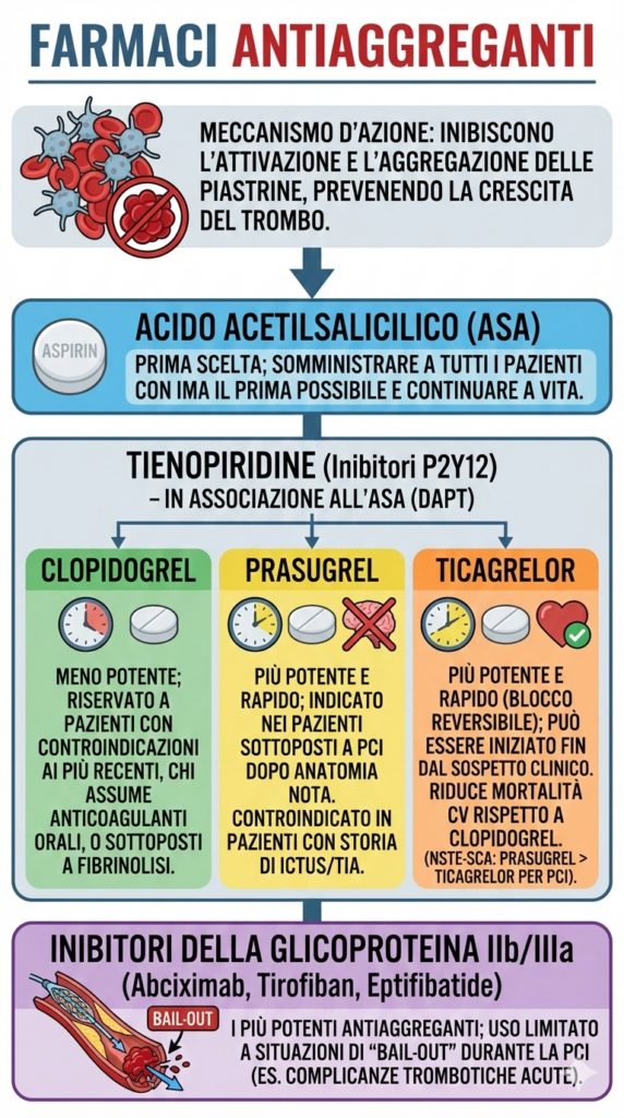 - inibitori della glicoproteina IIb/IIIa (Abciximab, Tirofiban, Eptifibatide): sono i più potenti antiaggreganti disponibili. Il loro uso è oggi limitato a situazioni di “bail-out” durante la PCI (es. complicanze trombotiche acute in sala di emodinamica).