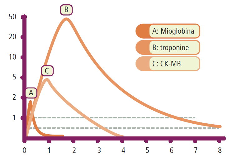 - CK e CK-MB massa: la creatinchinasi (CK) e la sua isoforma miocardica (CK-MB) iniziano ad aumentare dopo 4-6 ore, raggiungono un picco a circa 24 ore e si normalizzano in 48-72 ore. La loro specificità è limitata, poiché possono aumentare anche in seguito a danno muscolare, miocardite o cardioversione;