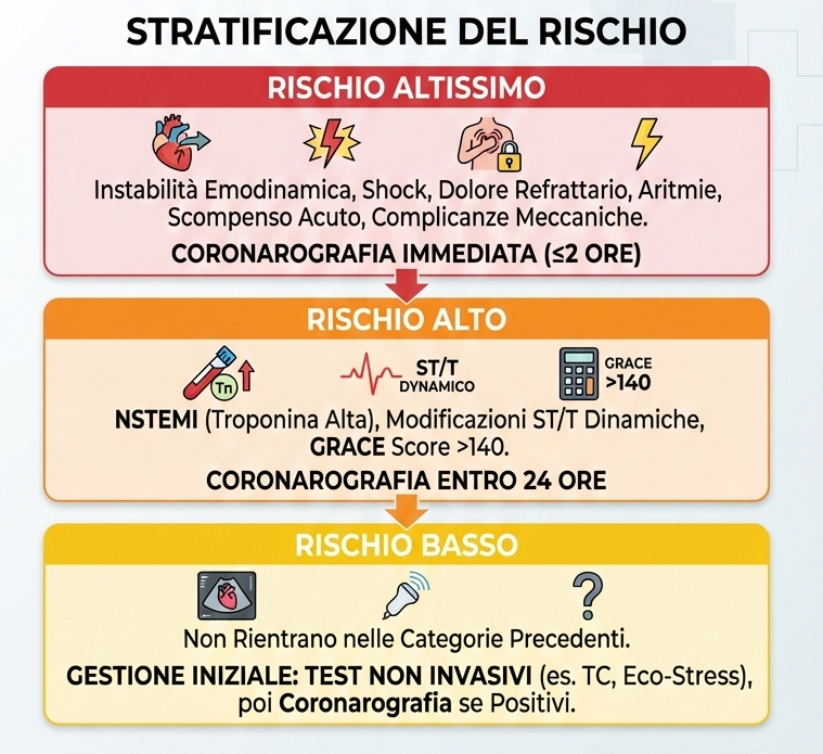 - rischio altissimo: pazienti con instabilità emodinamica, shock cardiogeno, dolore toracico refrattario, aritmie ventricolari maligne, scompenso cardiaco acuto o complicanze meccaniche. Questi pazienti richiedono una coronarografia immediata (entro 2 ore);