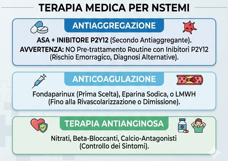 La gestione dell’NSTEMI è identica a quella dell’angina instabile; entrambe le condizioni rientrano nel quadro delle Sindromi Coronariche Acute senza sopraslivellamento del tratto ST (SCA-NSTE). L’approccio si basa sulla stratificazione del rischio ischemico per guidare la strategia invasiva.