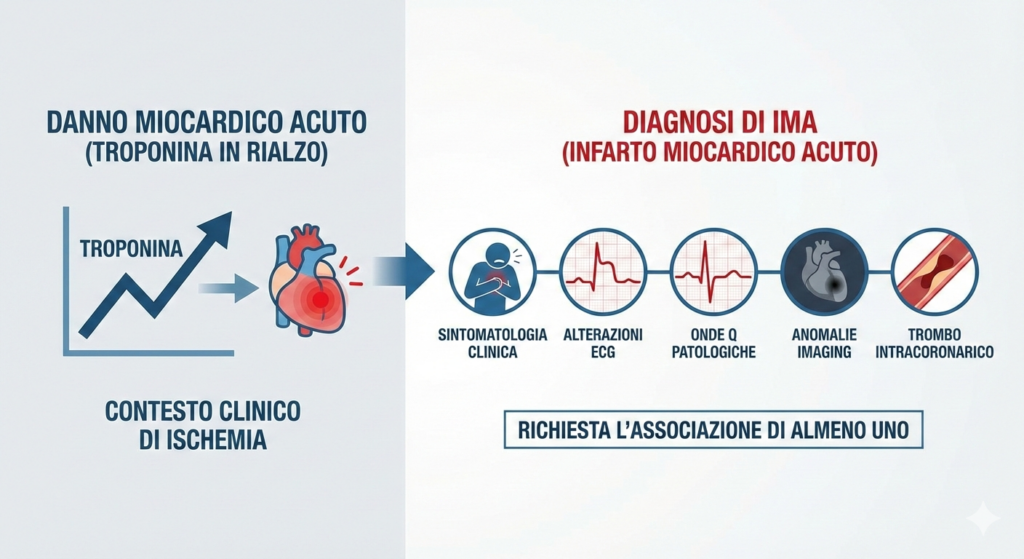 L’infarto miocardico acuto (IMA) rappresenta una delle manifestazioni più gravi della cardiopatia ischemica. Secondo la quarta definizione universale del 2018, il suo inquadramento diagnostico si basa su una distinzione cruciale tra “danno miocardico“, definito da un aumento dei valori di troponina, e “danno miocardico acuto“, caratterizzato da un andamento dinamico (rialzo e/o discesa) dello stesso biomarcatore.