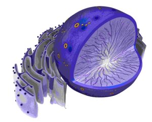 - Il reticolo endoplasmatico rugoso (RER), che è ricoperto di ribosomi sulla sua faccia esterna, assumendo una forma sacculare. La maggior parte delle proteine passa attraverso le sue membrane e si accumula nelle cisterne. Inoltre, alcune reazioni di sintesi di carboidrati avvengono all’interno del lume del RER, dove enzimi catalizzano la glicosilazione, ovvero l’aggiunta di zuccheri alle proteine neoformate. Le vescicole si staccano dal RER per essere trasportate all’apparato del Golgi durante il processo di indirizzamento delle proteine. Il RER è coinvolto nella sintesi di proteine destinate alla secrezione (proteine che saranno rilasciate all’esterno della cellula, destinate ai lisosomi o alla membrana plasmatica).