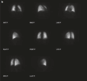 Utilizzata principalmente per escludere l’embolia polmonare in pazienti con RX torace completamente normale e bassa probabilità clinica, o in gravidanza per minimizzare la radiazione. L’acquisizione planare prevede solitamente 6-8 proiezioni standard (anteriore, posteriore, laterali, oblique).