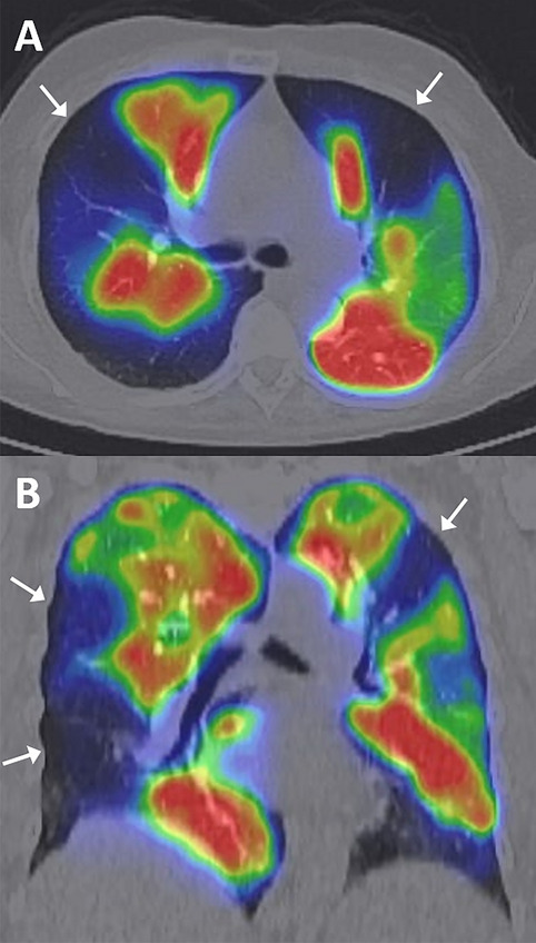 Le sezioni assiali (A) e coronali (B) mostrano multipli difetti di perfusione segmentali, in particolare nelle regioni periferiche di entrambi i polmoni (frecce bianche). Questi reperti sono caratteristici della CTEPH.