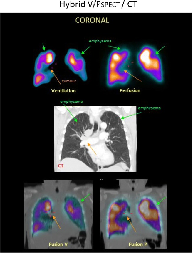 Paziente con BPCO, enfisema e tumore. Le sezioni coronali mostrano una distribuzione disomogenea della ventilazione con un pattern di deposizione di 99mTc-Technegas® tipico della BPCO. La perfusione segue il pattern della ventilazione. Si osservano difetti concordanti di ventilazione e perfusione in entrambi i lobi superiori (frecce verdi) e a destra del mediastino (frecce arancioni). Nella fila centrale della corrispondente sezione TC coronale, si osserva enfisema in entrambi i lobi superiori (frecce verdi), così come un tumore nel mediastino (freccia arancione). Sono mostrate le immagini di fusione tra TC e SPECT di ventilazione, e tra TC e SPECT di perfusione.