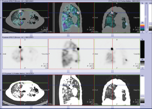 I moderni software di elaborazione permettono la fusione delle immagini funzionali (SPECT) con quelle anatomiche (CT). Algoritmi di segmentazione automatica, come quelli basati su intelligenza artificiale (ad esempio AutoLung3D), sono in grado di delimitare i lobi polmonari sulla base della CT e calcolare automaticamente la ripartizione percentuale della ventilazione e della perfusione per ogni singolo lobo.12 Questo approccio riduce la variabilità inter-osservatore associata ai metodi di quantificazione planare manuale.