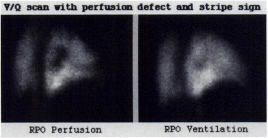 - Stripe sign (segno della striscia): si osserva quando una sottile linea di perfusione è conservata tra un difetto segmentale e la superficie pleurica. Questo reperto indica solitamente che la patologia non è di origine embolica (frequentemente enfisema), poiché gli emboli tendono a causare difetti pleura-basati;18