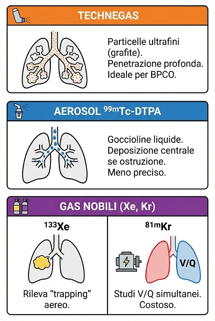 - Technegas: è un aerosol di particelle di carbonio ultrafini (grafite) marcate con 99mTc. Prodotto ad altissime temperature (2550 °C) in atmosfera di argon, il Technegas genera particelle così piccole (5-200 nm) da comportarsi quasi come un gas, raggiungendo gli alveoli più distali senza depositarsi massivamente nelle vie aeree centrali.7 È il radiofarmaco di scelta nei pazienti con BPCO, dove la turbolenza del flusso aereo causerebbe artefatti di deposizione centrale con i comuni aerosol liquidi;