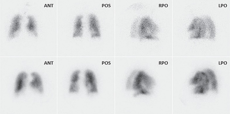 Immagini di perfusione (in alto) e ventilazione (in basso) in proiezione obliqua posteriore destra, che mostrano difetti a cuneo in un paziente con EP.