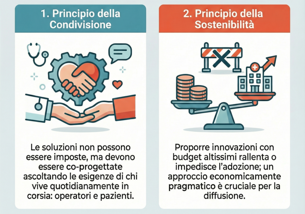 Il principio della “condivisione” è centrale. È impossibile imporre soluzioni innovative senza progettarle in stretta collaborazione con “chi vive in corsia quotidianamente”. L’ascolto delle esigenze non soddisfatte degli operatori e dei pazienti è il prerequisito per creare strumenti realmente utili ed efficaci.