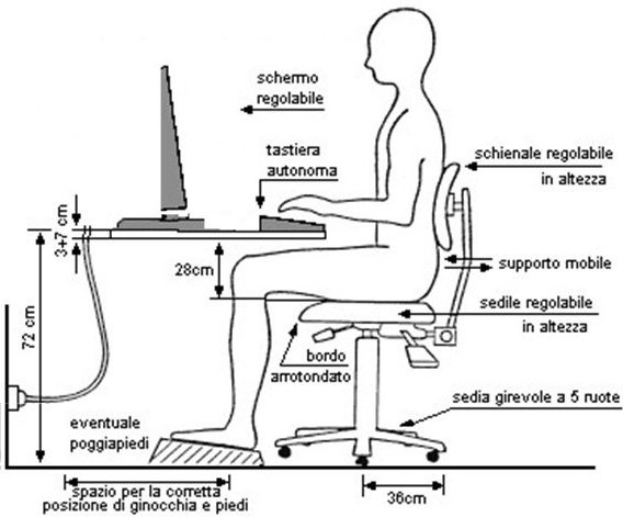 - postura corretta: durante l’utilizzo del computer, è necessario evitare di accavallare le gambe, poiché tale posizione provoca una torsione dannosa della colonna vertebrale.
