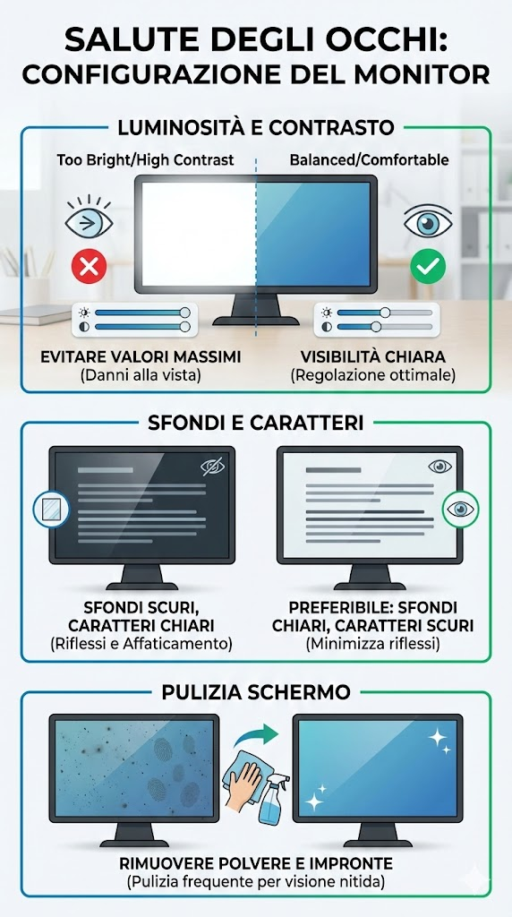 Lo schermo è l’elemento centrale della postazione di lavoro e la sua corretta configurazione è cruciale per la salute degli occhi: