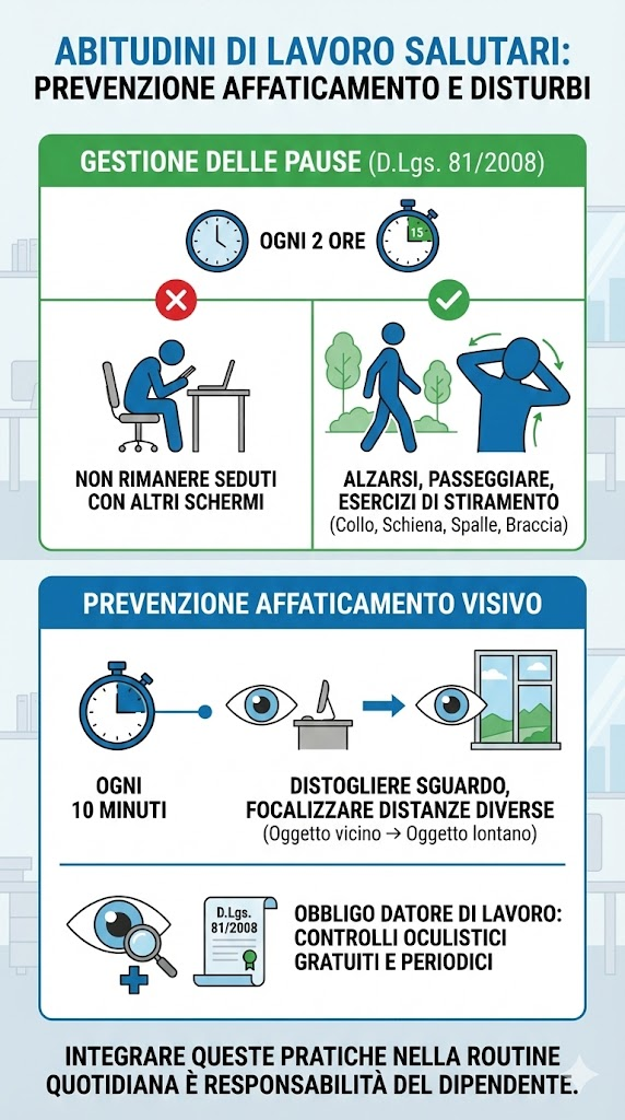 Oltre a una configurazione ergonomica della postazione, le abitudini personali adottate durante l’orario di lavoro sono determinanti per prevenire l’affaticamento generale, i disturbi della vista e i dolori muscolo-scheletrici. È responsabilità di ogni dipendente integrare le seguenti pratiche nella propria routine quotidiana.