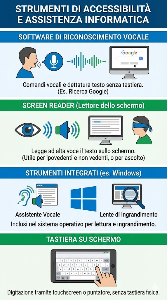 L’azienda si impegna a garantire che la tecnologia sia pienamente accessibile a tutti i dipendenti, inclusi coloro con limitazioni fisiche temporanee o permanenti. Promuovere un ambiente di lavoro inclusivo significa fornire gli strumenti necessari affinché chiunque possa contribuire al meglio delle proprie capacità. I sistemi operativi e le applicazioni moderne offrono diverse funzionalità di supporto integrate.