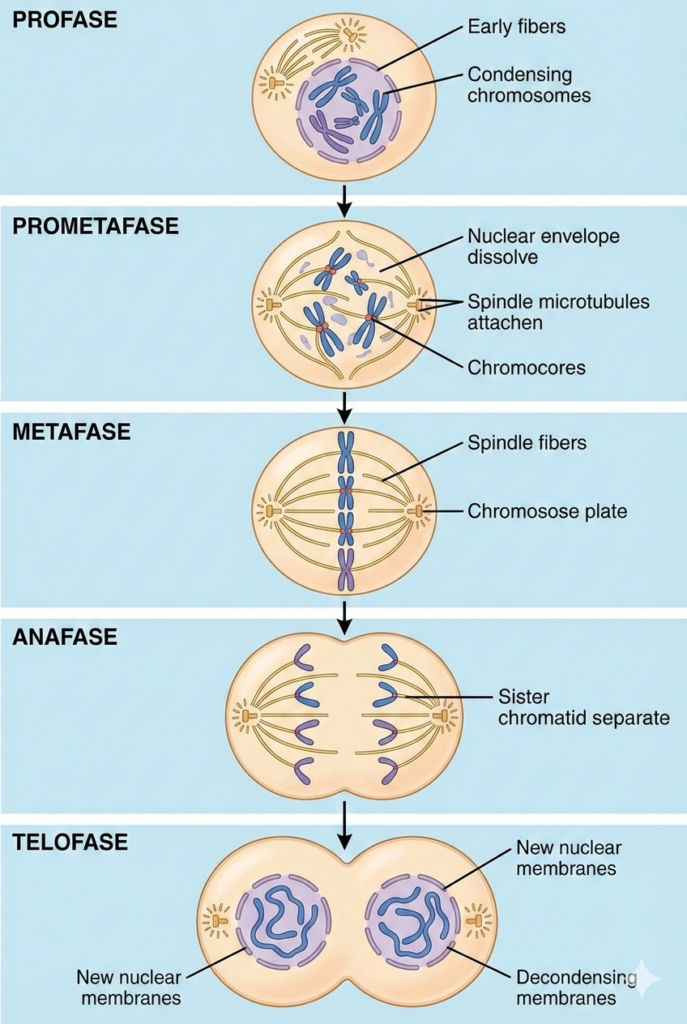- profase: la cromatina, fino a quel momento diffusa nel nucleo, si condensa progressivamente fino a formare i cromosomi visibili, ciascuno composto da due cromatidi fratelli identici uniti dal centromero. Il nucleolo scompare e nel citoplasma inizia a formarsi il fuso mitotico, una struttura di microtubuli che si origina dai centrosomi;