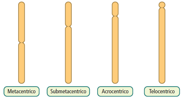 La struttura di un cromosoma condensato è definita da un centromero, una regione di costrizione che lo suddivide in due braccia cromosomiche: un braccio corto designato come “p” (dal francese petit) e un braccio lungo designato come “q”. In base alla posizione del centromero, i cromosomi sono suddivisi in: metacentrico, submetacentrico, acrocentrico e telocentrico.