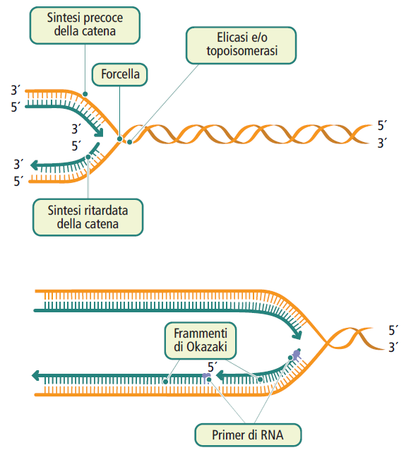 Durante la fase S, il DNA viene duplicato con un meccanismo di sintesi semi-conservativa. La doppia elica si apre e ciascun filamento funge da stampo per la sintesi di un nuovo filamento complementare. Il risultato è che le due molecole di DNA figlie sono identiche tra loro e formate ciascuna da un filamento parentale e uno di nuova sintesi. L’enzima principale è la DNA polimerasi, che sintetizza il nuovo DNA in direzione 5’→3′, aggiungendo nucleotidi all’estremità 3′. A causa di questa direzionalità, uno dei due filamenti, detto filamento veloce, viene sintetizzato in modo continuo. L’altro, il filamento lento, viene sintetizzato in modo discontinuo sotto forma di brevi segmenti chiamati frammenti di Okazaki, ciascuno dei quali richiede un innesco (primer a RNA). Successivamente, i primer vengono rimossi e i frammenti vengono uniti dall’enzima DNA ligasi. Al termine della fase S, il genoma della cellula è raddoppiato: ogni cromosoma è ora composto da due molecole di DNA identiche (cromatidi fratelli), e il corredo è definito diploide e dicromatidico (2n x 2).