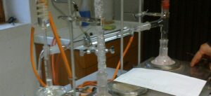L’esercitazione della prova consisteva nei due diversi metodi di distillazione, ovvero la distillazione frazionata e distillazione semplice, per avere appunto un confronto fra i due metodi avendo una stessa miscela. Tali distillazioni possono essere eseguite se lavoriamo con miscele formate da solventi con componenti totalmente miscibili, ma con diversa temperatura di ebollizione e di conseguenza con diversa volatilità. La miscela usata era un composto binario formato da alcool etilico denaturato e acqua distillata. La soluzione è stata realizzata ponendo in un cilindro graduato, con l’aiuto di un imbuto, 50 ml di alcool etilico e 50 ml di acqua distillata. Dopodiché prendiamo un riscaldatore elettrico, contente due matracci, in cui viene versata la sostanza con pietra pomice (materiale inerte) , che serve come regolatore di ebollizione. Le due distillazioni le effettuiamo a temperatura atmosferica. Nel caso della distillazione semplice, colleghiamo un tubo a T collegato a suo volta ad un termometro per il rilevamento della temperatura dei vapori. Il tubo a T è collegato ad un tubo refrigerante che possiede un ingresso posta verso il basso ed un’uscita posta verso l’alto; nel tubo refrigerante passa dell’acqua fredda in controcorrente a circa 15 °C e la sostanza evaporata. Queste sostanze però sono separate tra di loro e non hanno un contatto. L’acqua però, che si trova nel tubo refrigerante, interagendo con i vapori, si riscalda e di conseguenza si raffreddano i vapori stessi, avendo così il passaggio dallo stato gassoso a liquido, che non è altro che il distillato che viene raccolto da un contenitore. Ed è su questo principio che si basa la distillazione. Nel caso della distillazione frazionata, colleghiamo un matraccio ad una colonna denominata Vigreux, che di conseguenza è collegata ad un termometro per visualizzare e misurare la temperatura dei vapori; questa, è collegata ad un tubo refrigerante composto da una serpentina e da acqua dove avviene appunto il passaggio dei vapori a liquido. Dopo questo passaggio si ottiene il distillato che viene raccolto in un contenitore.