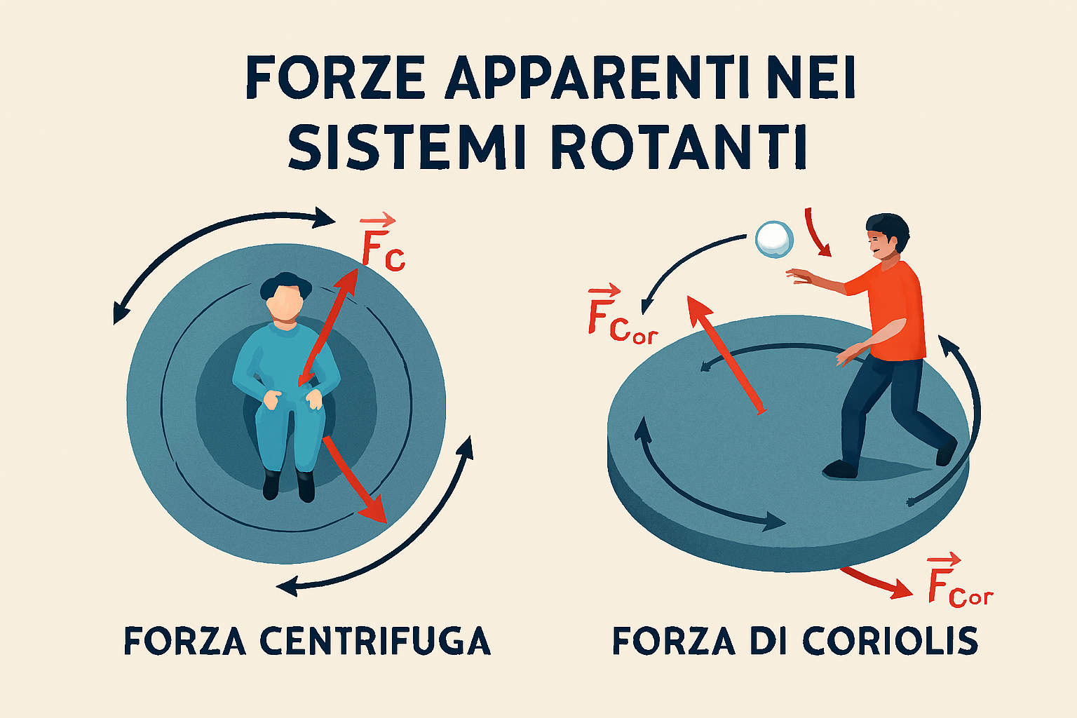 - forza di Coriolis: è un’altra forza apparente presente nei sistemi in rotazione. Si manifesta quando un corpo si muove con una certa velocità rispetto al sistema rotante. Ad esempio, una palla lanciata in linea retta su una piattaforma girevole apparirà, a un osservatore sulla piattaforma, deviare trasversalmente alla direzione del moto, seguendo una traiettoria curva a causa di questa forza.