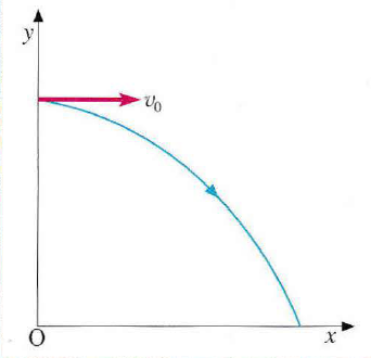 Come nell’immagine accanto, si consideri un corpo lanciato da un’altezza h con una velocità iniziale v₀ puramente orizzontale. Ponendo l’origine degli assi al suolo, le condizioni iniziali sono (x₀=0, y₀=h) e (v₀ₓ=v₀, v₀ᵧ=0). L’accelerazione ha componenti aₓ=0 e aᵧ=-g. Sostituendo questi valori nelle leggi orarie si ottiene: