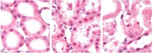 - Rigonfiamento cellulare: la membrana plasmatica si rigonfia, i microvilli vanno incontro a distorsioni, distensioni ed estroflessioni o scompaiono (degenerazione idropica o vacuolare);