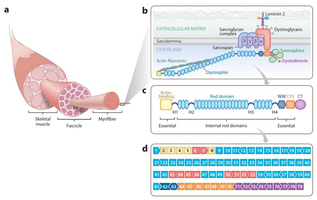 Il gene DMD non codifica per una singola proteina, ma attraverso un sofisticato sistema di promotori interni e splicing alternativo, genera molteplici isoforme espresse in tessuti diversi. L’isoforma full-length di 427 kDa (Dp427) è tipica dei muscoli striati e dei neuroni corticali.11