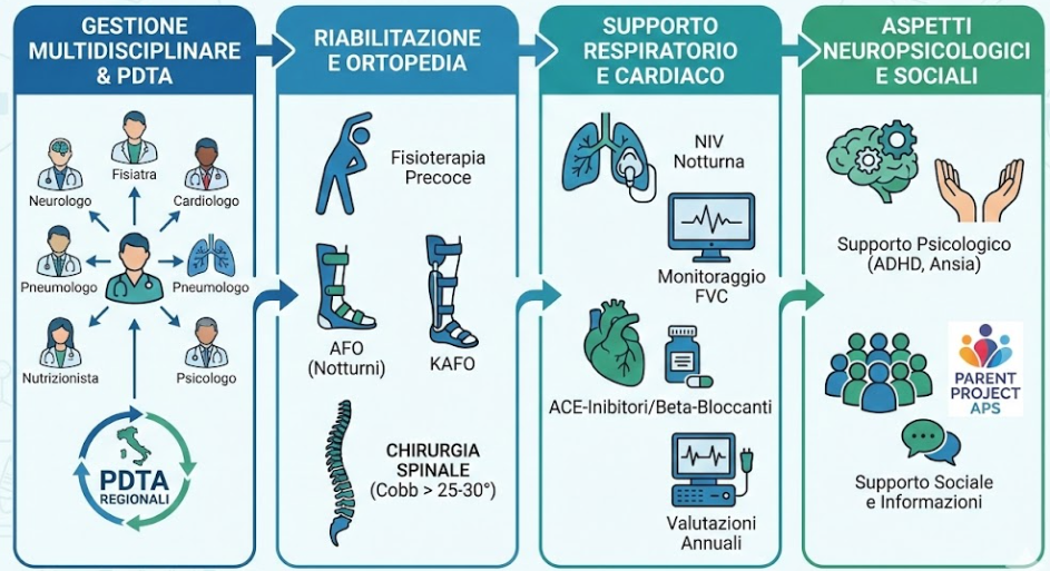 La gestione multidisciplinare coinvolge neurologi, fisiatri, cardiologi, pneumologi, nutrizionisti e psicologi.