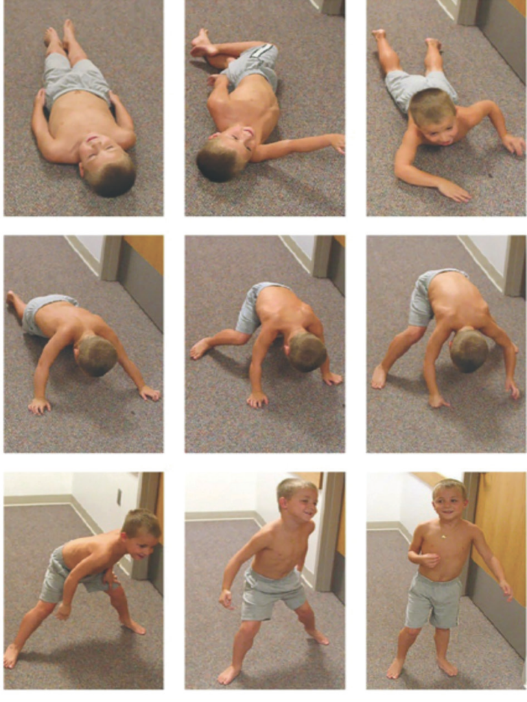 Il segno di Gowers, l’uso delle braccia per “arrampicarsi” sulle proprie gambe per alzarsi da terra, è un indicatore patognomonico della debolezza dei muscoli prossimali degli arti inferiori.