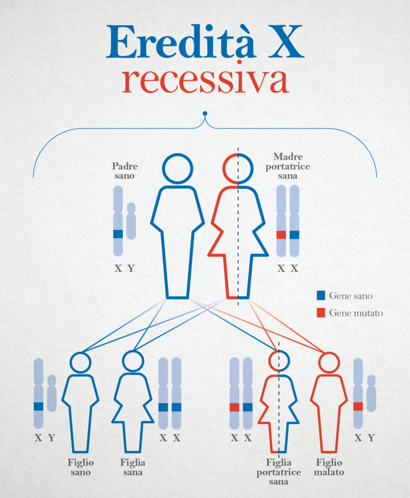 | Localizzazione | Cromosoma Xp21.2 | Trasmissione recessiva legata all’X |