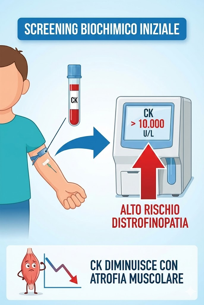 Il sospetto clinico deve essere immediatamente seguito dal dosaggio della creatin-chinasi (CK). Valori superiori a 10-20 volte il limite normale nei bambini maschi indicano fortemente una distrofinopatia; nella DMD classica, i livelli possono superare i 10.000-20.000 U/L.