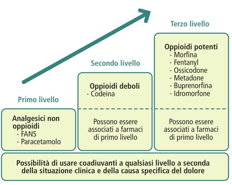La strategia farmacologica per il controllo del dolore segue la scala analgesica a 3 gradini dell’OMS, un approccio progressivo che prevede anche l’uso di farmaci adiuvanti a ogni livello.