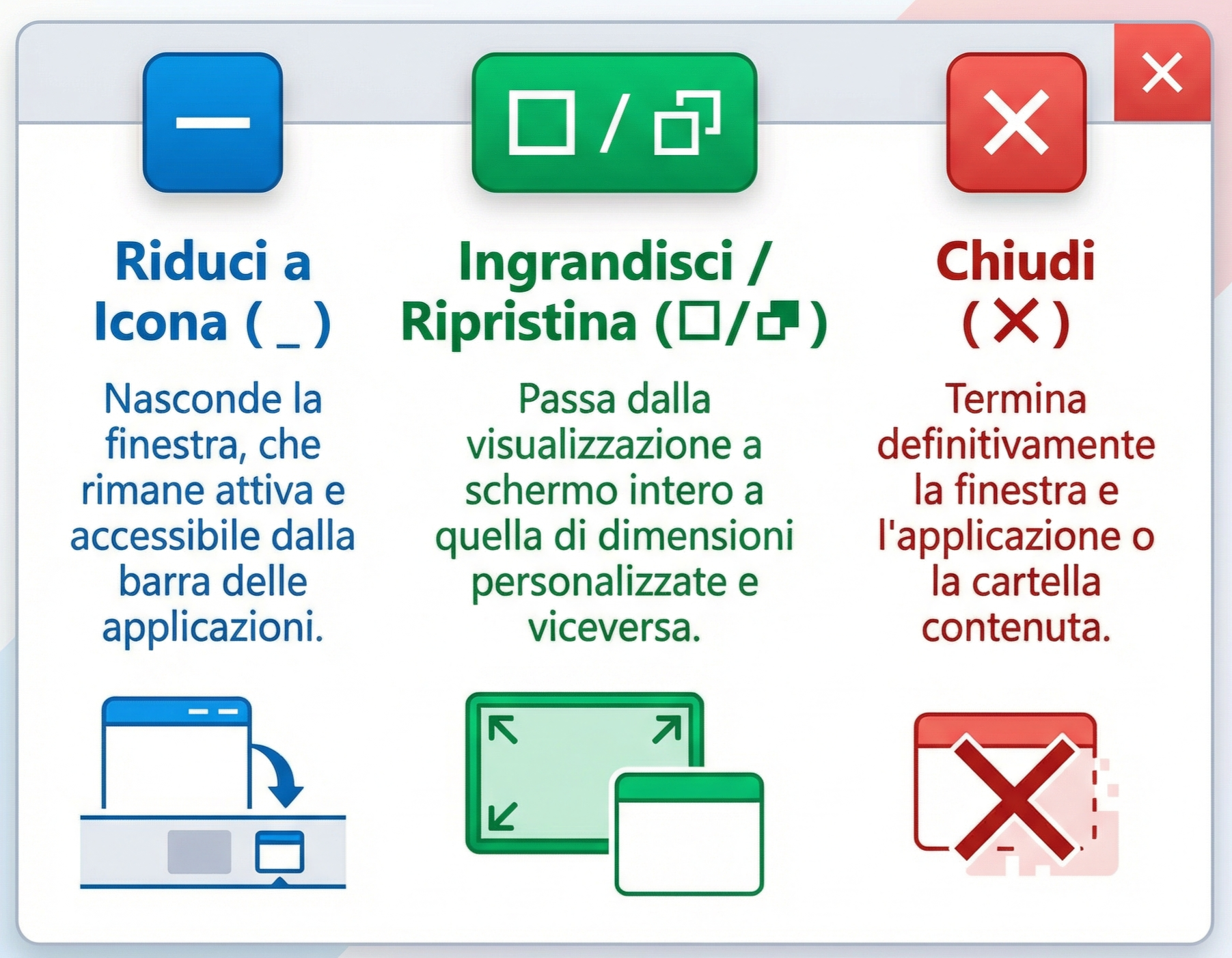 - chiudi (icona: X): questo pulsante provoca la chiusura definitiva della finestra e dell’applicazione o cartella in essa contenuta.