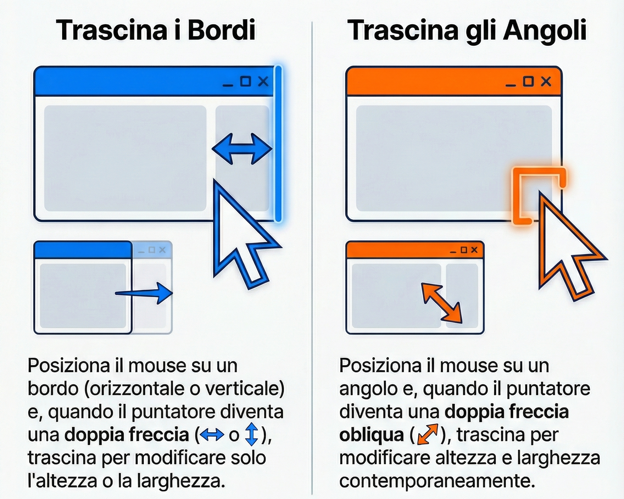 - posizionare il puntatore su uno dei quattro angoli della finestra. Il puntatore assumerà la forma di una doppia freccia obliqua. Cliccare e trascinare l’angolo permette di modificare contemporaneamente l’altezza e la larghezza della finestra.