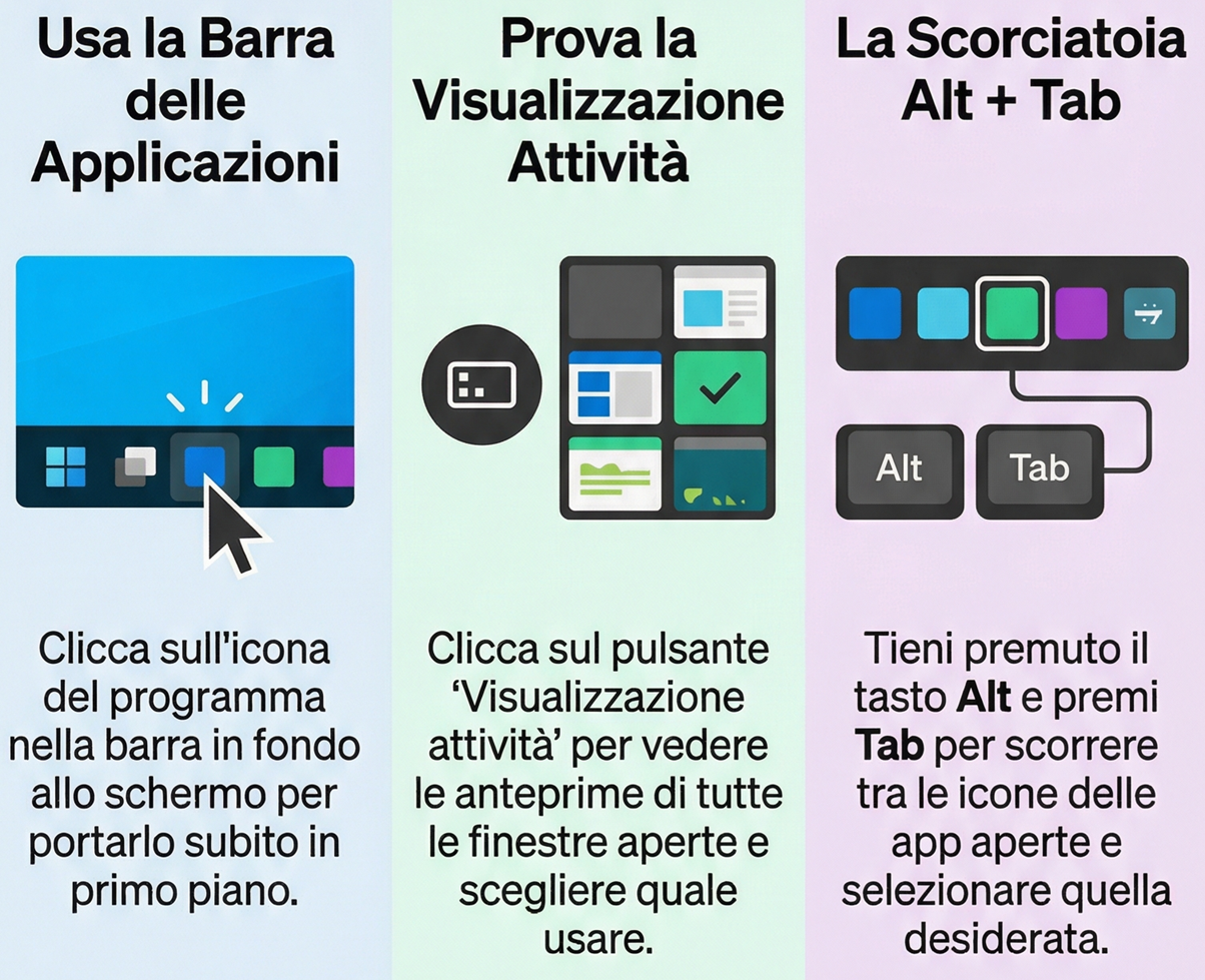 Visualizzazione attivitàpresente sulla barra delle applicazioni, si accede a una schermata che mostra le anteprime di tutte le finestre e applicazioni attualmente aperte, consentendo di selezionare quella desiderata con un clic; - utilizzo della combinazione di tasti (Alt + Tab): tenendo premuto il tasto