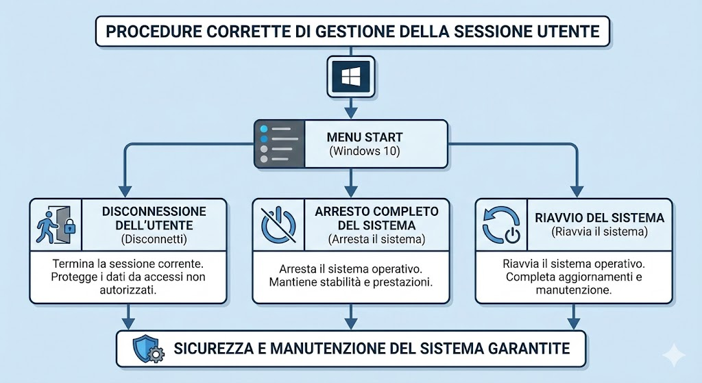Seguire procedure standardizzate per la chiusura di una sessione di lavoro è un aspetto critico della sicurezza informatica e della manutenzione del sistema. Operazioni come la disconnessione, l’arresto o il riavvio, se eseguite correttamente, garantiscono la protezione dei dati dell’utente da accessi non autorizzati e contribuiscono a mantenere la stabilità e le prestazioni del sistema operativo. In Windows 10, queste funzioni sono accessibili principalmente tramite il menu Start.