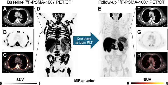 Questo paziente presentava un’elevata espressione di PSMA alla PET pre-terapeutica, in particolare nella colonna toracica e nelle coste. Il valore di captazione standardizzato (SUVmean) era superiore alla soglia di 8,54. Dopo un solo ciclo di RLT tandem, l’antigene prostatico specifico (PSA) è sceso da 674 μg/l a 15,6 μg/l (-97,69%).