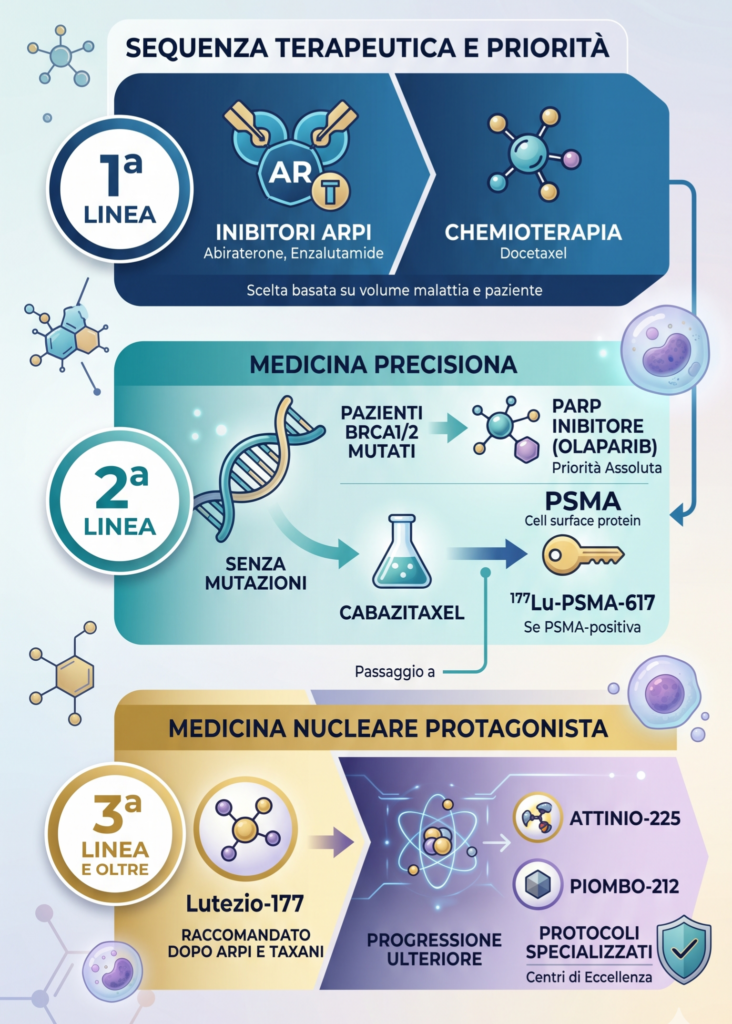 - terza linea e oltre: la medicina nucleare diventa protagonista. Il Lutezio-177 è raccomandato per i pazienti già trattati con taxani e almeno un ARPI. In caso di progressione ulteriore, l’accesso a protocolli con Attinio-225 o Piombo-212 può essere considerato in centri specializzati.