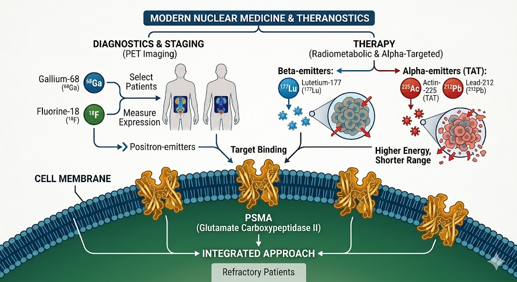 La medicina nucleare moderna integra radioisotopi diversi per scopi differenti: emettitori di positroni come il Gallio-68 (68Ga) o il Fluoro-18 (18F) per la Tomografia a Emissione di Positroni (PET) finalizzata alla stadiazione e alla selezione dei pazienti, ed emettitori di particelle beta o alfa per la terapia radiometabolica.