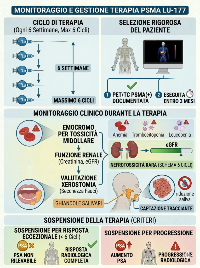 La selezione del paziente è rigorosa: deve essere documentata la positività al PSMA tramite PET/TC eseguita entro 3 mesi dall’inizio del trattamento. Durante la terapia, il monitoraggio include: