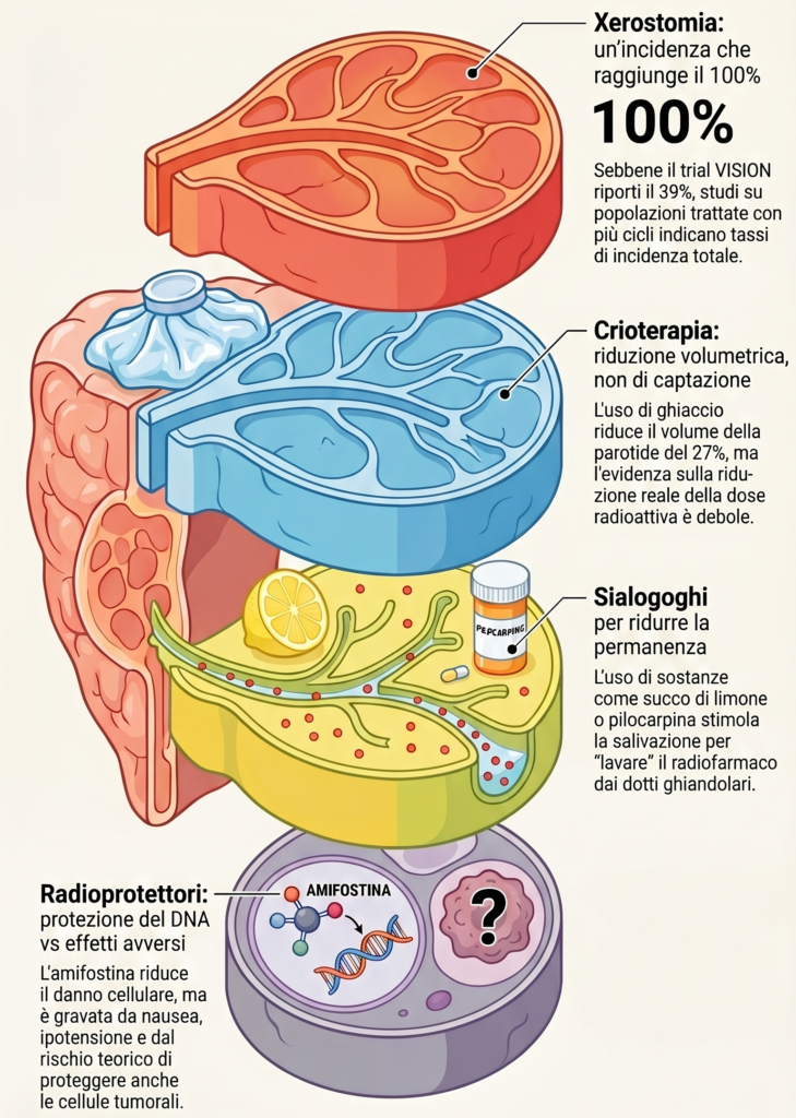 La secchezza delle fauci è la tossicità più frequente e impattante, specialmente con gli emettitori alfa. Nel trial VISION, il tasso di xerostomia di grado 1-2 è stato del 39%, ma studi su popolazioni trattate con più cicli indicano tassi che possono raggiungere il 100%. Diverse strategie sono state testate: