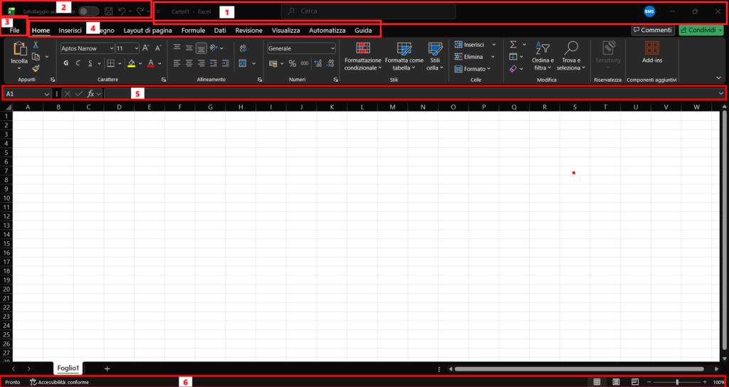 L’interfaccia di Excel è composta da diversi elementi chiave, ognuno con uno scopo preciso:
