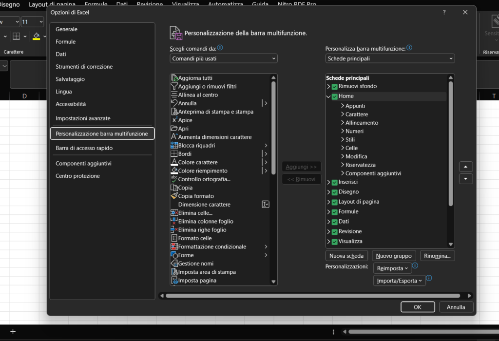 Excel offre la possibilità di personalizzare la Barra Multifunzione per adattarla alle proprie esigenze operative, senza richiedere competenze di programmazione. Accedendo al percorso File > Opzioni > Personalizzazione barra multifunzione, l’utente può: