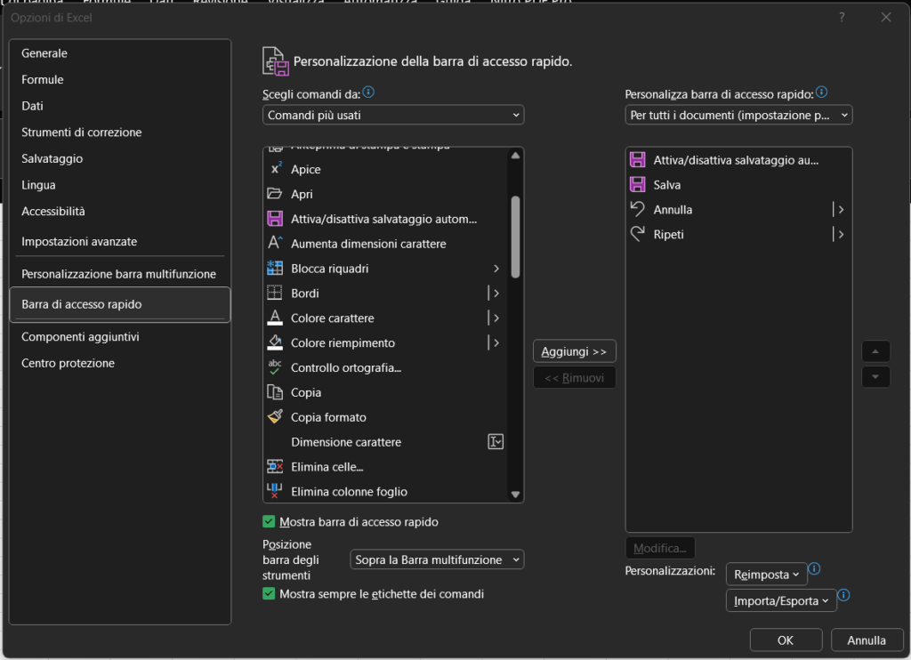 Come per la barra multifunzione, anche la barra di accesso si può personalizzare accedendo al percorso File > Opzioni > Barra di accesso rapido.