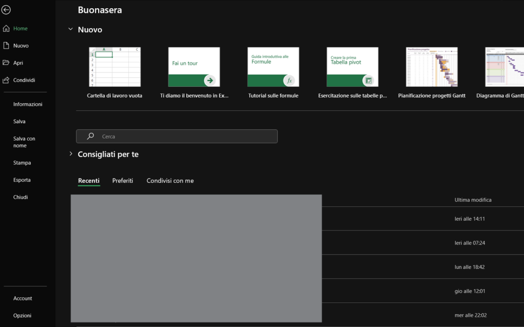 La visualizzazione Backstage, accessibile cliccando sulla scheda File, è il centro di controllo per tutte le operazioni a livello di file, distinguendosi dalle operazioni sui dati contenuti nel foglio. Qui si trovano i comandi per la gestione del ciclo di vita del documento: Nuovo, Apri, Salva, Stampa, Condividi, Esporta e Opzioni per la configurazione avanzata dell’applicazione. Per uscire rapidamente dalla Visualizzazione Backstage e tornare al foglio di lavoro, è sufficiente premere il tasto ESC o cliccare sulla freccia “Indietro” in alto a sinistra.