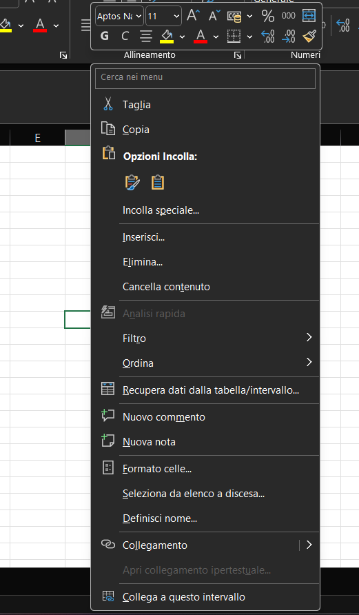 Un clic con il pulsante destro del mouse su un qualsiasi elemento (una cella, un grafico, un oggetto) attiva un Menu contestuale (o di scelta rapida). Questo strumento è di fondamentale importanza perché, secondo i principi di una progettazione UI efficace, deve contenere tutti i comandi pertinenti all’elemento selezionato. Ciò lo rende un’interfaccia universale e indipendente dal tipo di input (mouse, tocco, tastiera), garantendo che ogni utente possa accedere a tutte le funzionalità contestuali, indipendentemente dal dispositivo utilizzato. Insieme al menu contestuale, appare anche la Barra di formattazione rapida, una piccola barra degli strumenti che fornisce un accesso immediato ai comandi di formattazione più comuni, come grassetto, colore del carattere e allineamento.