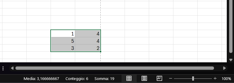 +e-permettono di regolare rapidamente il livello di ingrandimento del foglio di lavoro, per avere una visione d’insieme o per concentrarsi sui dettagli; - reportistica passiva: una delle sue funzioni più utili e immediate è la capacità di fornire aggregazioni di dati al volo. Selezionando un intervallo di celle contenenti valori numerici, la Barra di Stato visualizza automaticamente calcoli come la somma, la media e il conteggio dei valori selezionati, senza la necessità di scrivere alcuna formula. Questa funzionalità, nota anche come “Calcolo Automatico”, è preziosa per validazioni immediate e analisi esplorative dei dati.