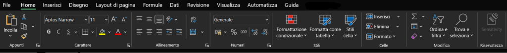 La Ribbon è organizzata secondo una gerarchia intuitiva. È suddivisa in schede (es. Home, Inserisci, Dati), che rappresentano le principali aree funzionali del programma. Ogni scheda, a sua volta, contiene diversi Gruppi di comandi correlati. Ad esempio, la scheda Home contiene i gruppi Carattere, Allineamento e Numeri. Ogni strumento all’interno di un gruppo è dotato di un aiuto contestuale (tooltip) che appare semplicemente posizionando il cursore del mouse su di esso, fornendo una breve descrizione della sua funzione.