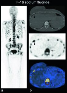 Un’evoluzione significativa in questo campo è rappresentata dallo scan osseo mediante Fluoro-18 fluoruro di sodio (NaF), eseguita tramite tomografia a emissione di positroni (PET). Questa tecnica offre una risoluzione spaziale e un contrasto superiori rispetto alla scintigrafia tradizionale con difosfonati e, laddove disponibile, ne sta progressivamente prendendo il posto.